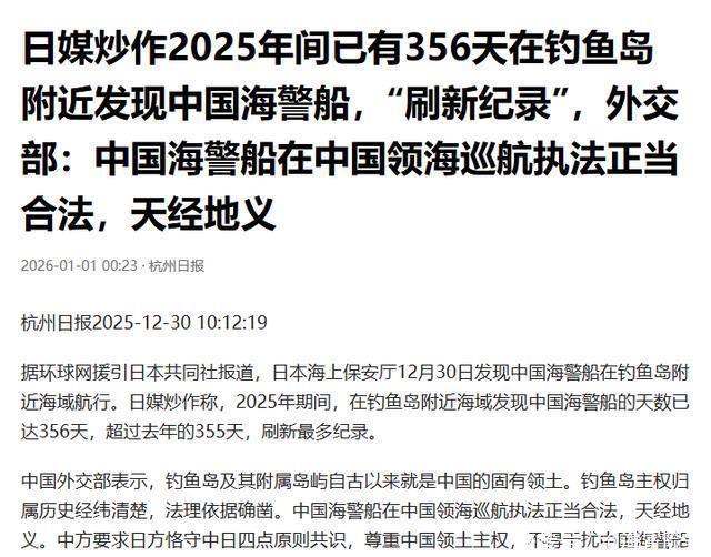 钓鱼岛问题同步升温的危险信号 就在日本外务省就台海演习发声的同时,日本海上保安厅也抛出消息,2025年中国海警船在钓鱼岛周边巡逻天数达356天,创下2012年以来新高。 日方随即炒作“局势日益严峻”,声称将“采取一切必要措施应对”。